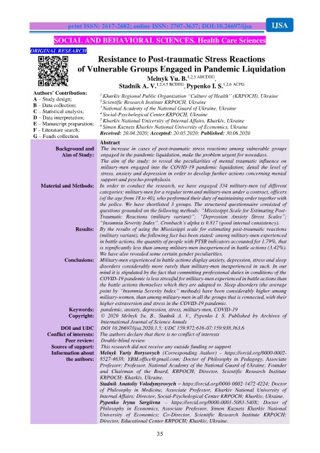 Copyright: © 2020 Melnyk Yu. B., Stadnik A. V., Pypenko I. S. Published by Archives of